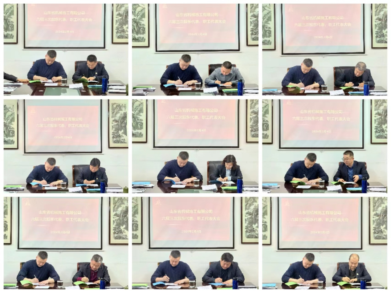 2024年2月4日,山東省機械施工有限公司第六屆三次股東代表、職工代表大會在公司會議室召開。公司股東代表、職工代表、先模代表近40余人參會。會議審議通過了董事長行政工作報告、監(jiān)事報告、財務(wù)預(yù)決算報告等事項;會上沈繽董事長與各承包人簽訂2024年承包合同;表彰了2023年度先進單位和個人;動員全體職工在新的一年統(tǒng)一思想、堅定信心、再創(chuàng)佳績,為努力開創(chuàng)山東機施各項工作新局面做出更大的貢獻。