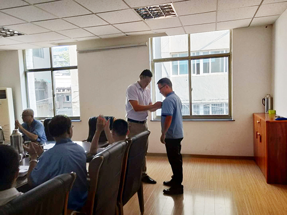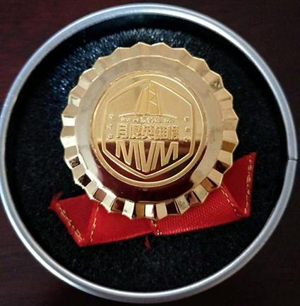 84日盧留英同志受邀參加了公司每月一次高層會議,董事長沈繽親自為其授獎價值5000元的MVM純金勛章。該同志還將享受2019年公司組織的出國旅游活動、佩戴金質勛章,前排就坐參加年度表彰大會。
