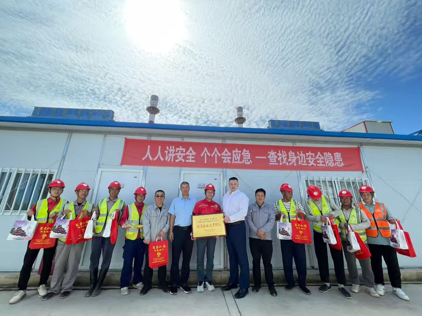 國(guó)慶、中秋兩節(jié)臨近,9月17~18日,沈繽董事長(zhǎng)帶隊(duì)到公司承建的肥城、棗莊兩地礦山項(xiàng)目進(jìn)行檢查慰問(wèn),公司常務(wù)副總經(jīng)理于海波,公司安全總監(jiān)、質(zhì)安部部長(zhǎng)高風(fēng)順,興發(fā)子公司總經(jīng)理丁德利陪同前往。沈董親自安排為施工一線職工帶去了新鮮出爐的扒雞、月餅等慰問(wèn)品,深切表達(dá)出對(duì)一線職工的關(guān)愛(ài)之情。