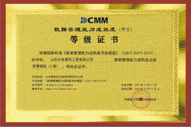 【喜訊】山東省機(jī)械施工有限公司(山東興發(fā)建筑工程有限公司)成功斬獲數(shù)據(jù)管理能力成熟度(DCMM)2級(jí)認(rèn)證!